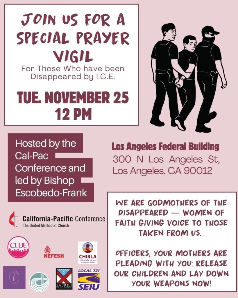 For months, CLUE and women of faith have joined together weekly in front of the LA Federal Building where men, women, and children are being held by ICE, HSI, The National Guard, and Marines with no due process. On Tuesday, November 25, members of Cal-Pac will host this vigil and we invite you to join us as a Cal-Pac woman of faith.
