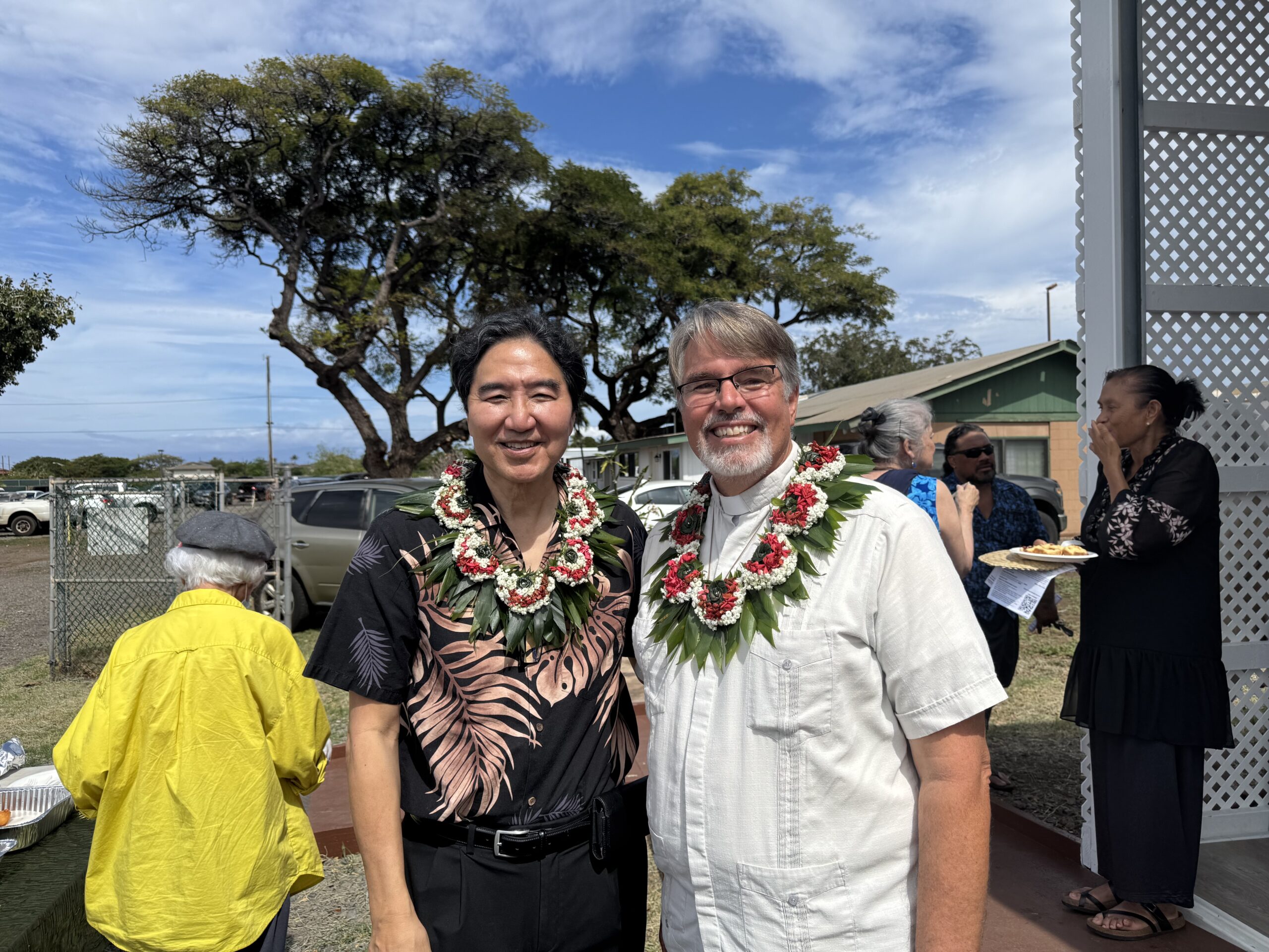 The garden sanctuary was full to overflowing with members of the congregation and Lahaina at large, including interfaith leaders. The church choir shared hymns in Tongan, blessing the new space with joyful song. Brad Hurte played trumpet, sharing Great is Thy Faithfulness, and accompanying the closing hymn. Three quilts hung on the wall behind the choir, a beautiful recreation of the stained glass in the building that was lost in the fire.
